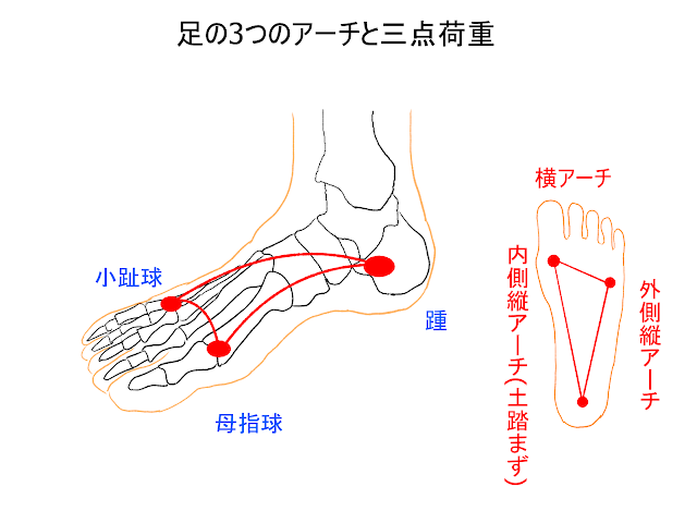 足裏は3つのアーチと三点荷重、足首はまっすぐの正常なアラインメント。この状態が望ましいです。