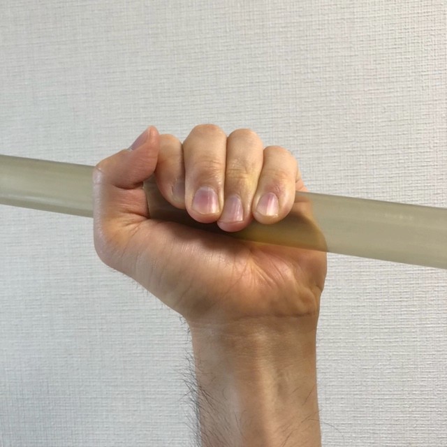手首を固め手首の角度を変えずに、バーに手の平を押し当てながら指を回して握ります。これで完成です。